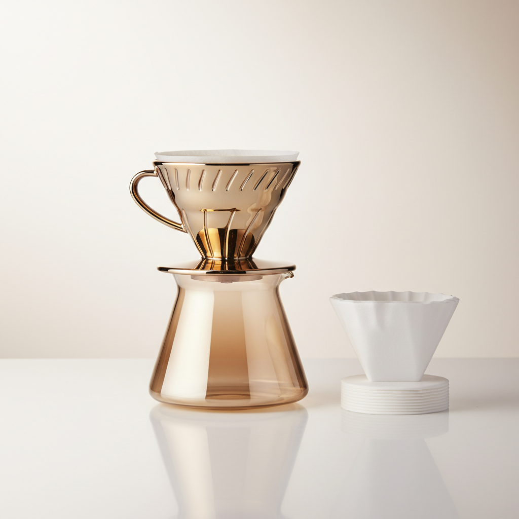 The Gold Leaf Drip Set elevates the manual brewing ritual into an art form. This premium pour-over set features a borosilicate glass dripper with a proprietary titanium-nitride coating that gives it a stunning warm gold finish — beautiful enough to display, tough enough for daily use.