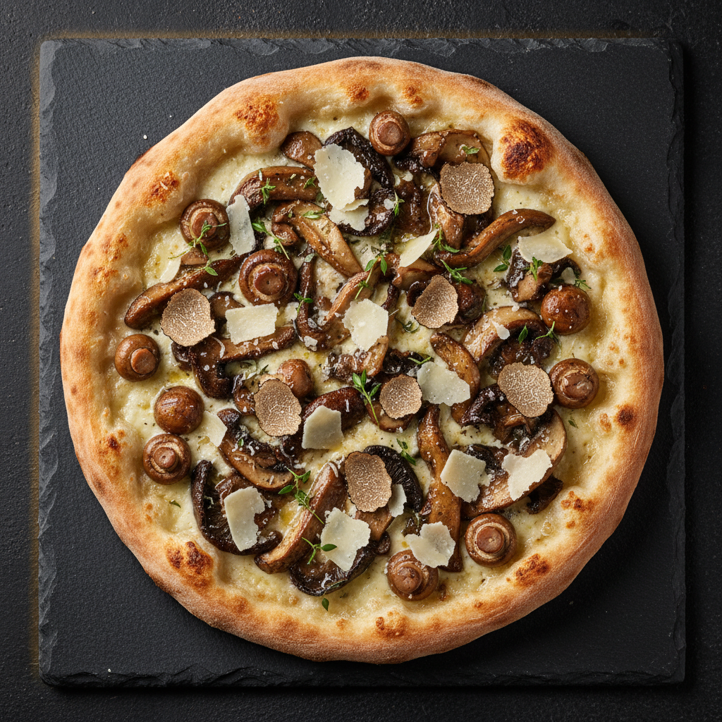 Our premium signature creation. Truffle-infused cream base, wild mushroom medley (porcini, shiitake, cremini), freshly shaved black truffle, aged Parmigiano-Reggiano, and fresh thyme. A true luxury experience.